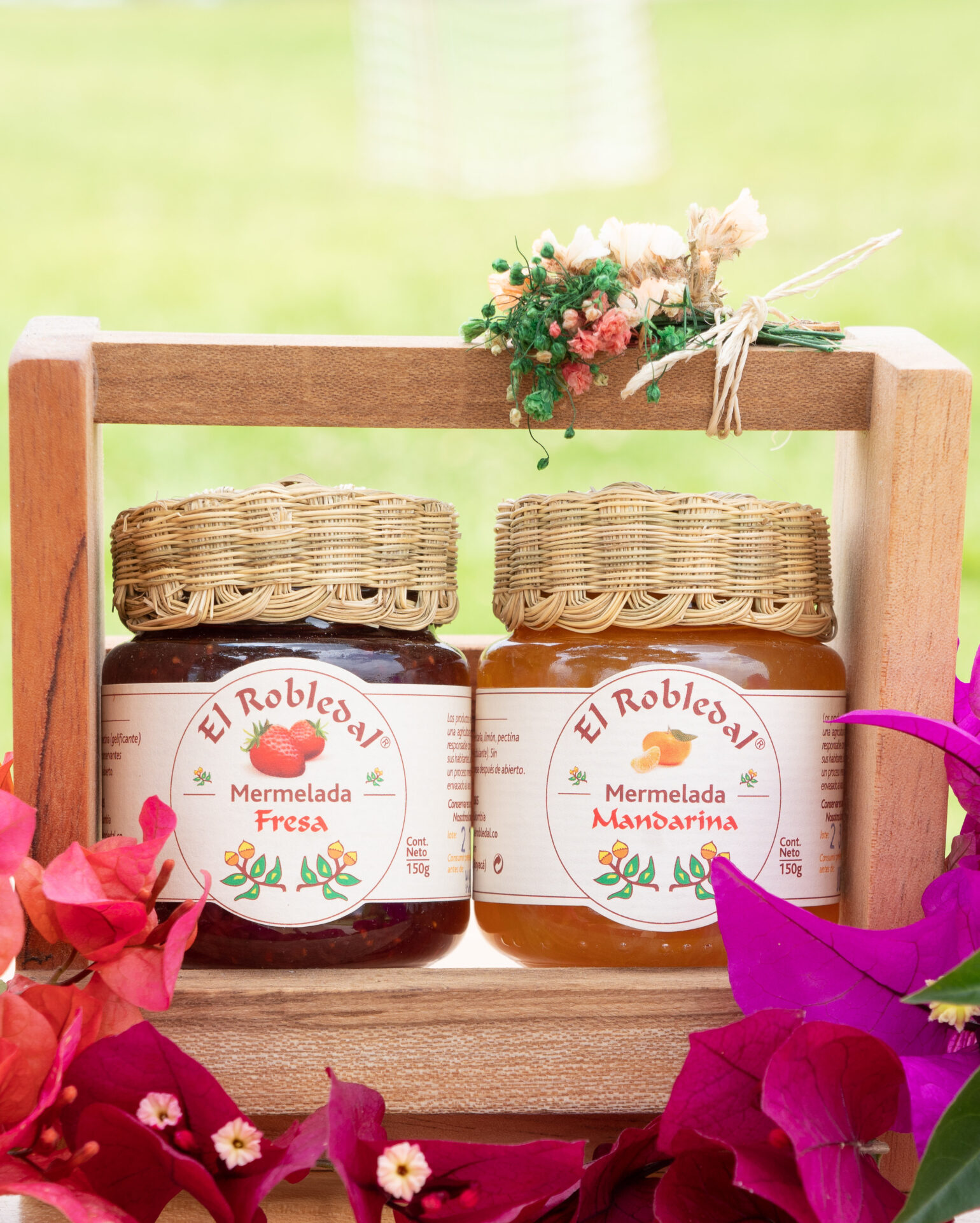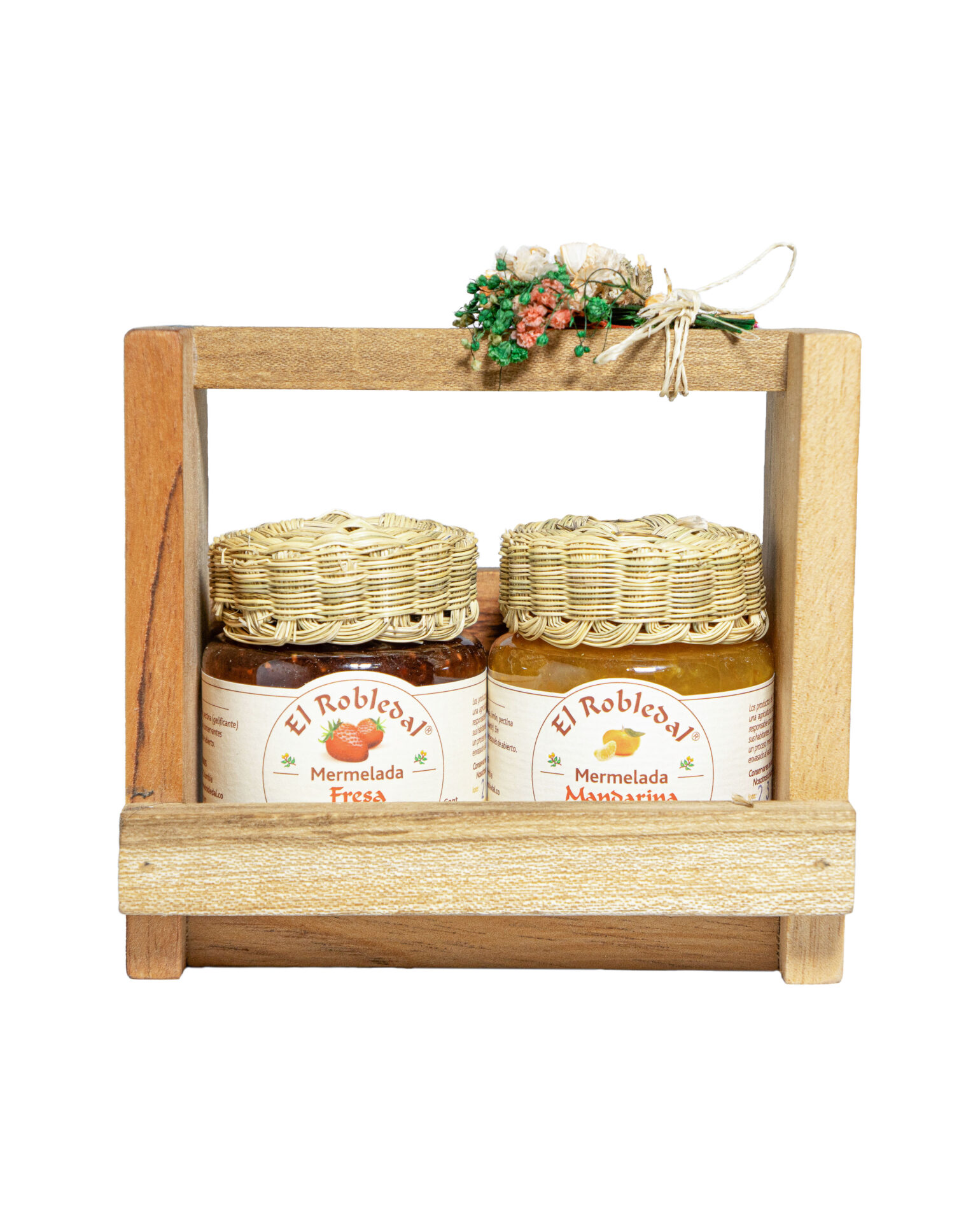Elegante caja de madera con dos mermeladas artesanales de fresa y de mandarina de 150 g. Este producto es elaborado por El Robledal